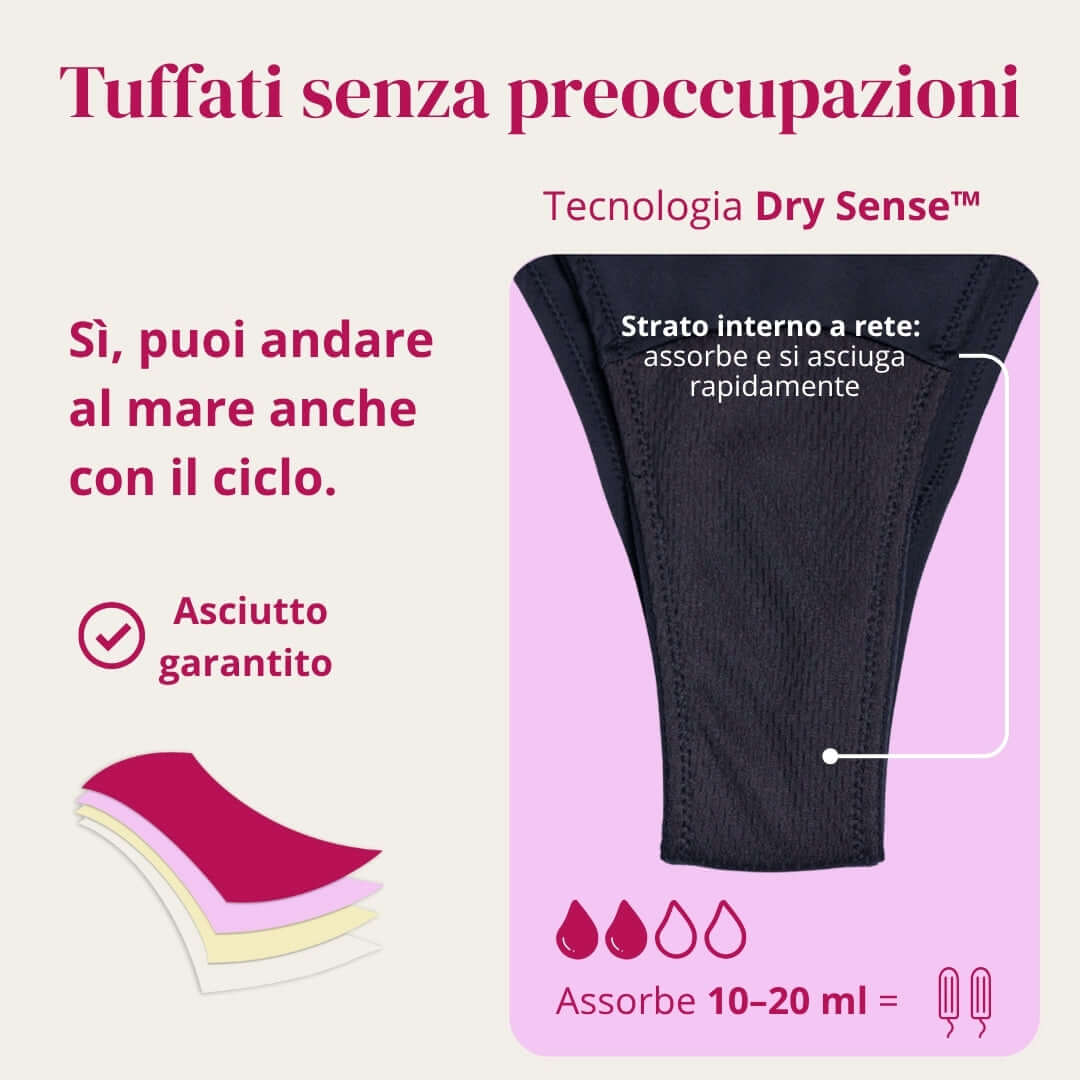 Sì! Il costume assorbente OCEAN è dotato della tecnologia DRYSENSE+ a 4 strati, che garantisce un’assorbenza elevata fino a 30ml di liquido. Assorbe rapidamente il flusso, lo trattiene al centro e impedisce fuoriuscite grazie alle cuciture sigillate. Ti sentirai sempre asciutta!